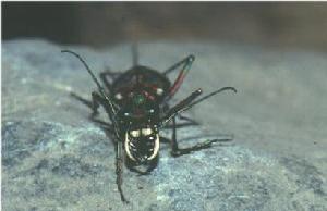 幼蟲生活於成蟲挖掘的垂直形土穴中,活動時若受驚則退入洞內。成蟲飛翔力強,常在山澗小路上的行人面前迎飛,故得名 “攔路虎”。成蟲或幼蟲均為肉食性,以捕食活蟲及其他小型動物為生,故為天敵昆蟲。