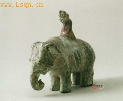 彩繪象戲陶俑,長10.8厘米、高10.3厘米。 象呈靜立狀,象鼻下垂蜷曲,似在往嘴內送食。其背上跪坐一男俑,身飾彩,頭戴冠,雙手扶膝,低首沉思。