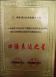 榮獲:“口語之星”-----口語表達比賽一等獎,拼詞比賽二等獎,快速閱讀三等獎,個人全能二等獎以及電影配音團體二等獎和團隊全能三等獎等獎項。大賽後,參加世界10位知名外教封閉式英語夏令營10天10夜。
