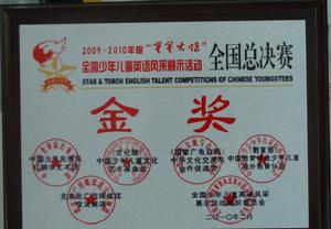 在2010年春節北京的全國總決賽中榮獲金獎!(證書編號:100907);“星星火炬”全國活動由(團中央)中國先鋒隊紅領巾藝術團、(國家廣電總局)中華文化交流與合作促進會、(文化部)中國少年兒童文化藝術基金會、(教育部)中國教育學會少年兒童校外教育分會、北京北廣傳媒優優寶貝頻道、全國少年兒童英語風采展示活動組織委員會共同主辦。