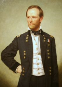 威廉·特庫姆塞·謝爾曼(William Tecumseh Sherman),美國南北戰爭中的聯邦軍將領。1840年畢業於西點軍校後,先後在各地服役。由於對軍旅生涯前途的悲觀,1853年謝爾曼辭去軍職輾轉於多個行業,但都沒能獲得成功,直到在曾經軍隊中的好友布拉克斯頓·布雷格的幫助下,進入愛荷華州軍事學院擔任教員,他才得以擺脫困境。憑藉對教育和軍事的熱愛,對學生的寬宏大量,謝爾曼成為一名優秀的教員並逐漸展示出他的才華,內戰期間他在聯邦軍中有著很高的威望和號召力,便得益於此。戰爭後期成為西部戰區總司令,並且發起舉世聞名的大進軍。
