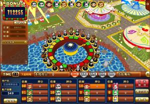 6.畫面中的轉輪和指針開始轉動,當停下後,指針指向的顏色和動物(必須同時滿足)就是中獎動物,比如指針指向綠色獅子,如果玩家在12門押註裡押了綠色獅子,那么他的這一押注就得分,分數為押注分數乘以倍率。