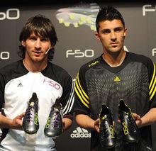 梅西、比利亞代言adidasF50系列 2010年5月11日,愛迪達正式對外發布“史上最輕”的足球戰靴—F50 adiZero。結合尖端科技與出眾設計全新打造的F50 adiZero僅重165克,是迄今為止最輕、最快的足球戰靴。2009年世界足球先生梅西與2008年歐洲杯金靴獎得主比利亞出席了在西班牙加泰羅尼亞F1賽道舉行的發布活動。