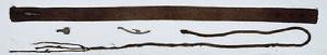 組是用絲線交叉編織的帶狀編織物,一般用於系衣衽或穿綴佩飾。當時的衣服沒有紐扣,深衣、直裾長衣等等上衣下裳相連的服裝均要以大帶繫結。大帶分絲織類和皮革類。楚地多產組,編織組帶是楚國地區的傳統工藝產品,《尚書·禹貢》記載荊州有組上貢。組帶在戰國楚墓中多有發現,皆製作精良,技藝高超。該組帶用褐色粗絲線編織而成,厚實緻密,可能為著深衣類長衣用帶。組帶一端的圓形扣眼,恰好可嵌入銅帶鉤背面的圓扣,另一頭有三個可鉤住帶鉤頭的的鉤眼,可因腰圍的粗細變化使用。還附有由三股粗絲線織成辮狀的褐色圓絲帶一根及帶鉤3個。古人腰間多掛有佩飾之類,這種圓形長絲帶和2個小帶鉤可能是穿掛玉或玻璃等佩飾之用。組帶給我們揭示了當時服飾系帶的情況。