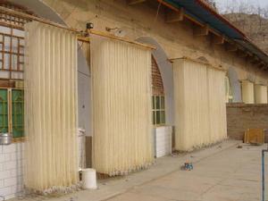 9、二次拉長,將面從架子上垂直下拉至1.80米長,進行晾曬;