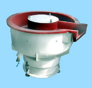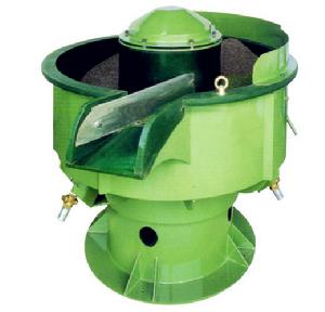 該機是通過振動電機做激振源,使工作筒體產生三元振動的工作原理。振動電機上下裝有偏心重塊。當振動電機高速鏇轉時,兩個偏心塊所產生的激振力在水平面內沿圓周方向變化,使機體產生水平面內的圓周運動,同時由於激振力不通過機體的質心。因此產生了傾斜的激振力矩,使筒體繞水平軸搖擺,由於筒體底部呈圓形狀,各點的振幅不一致。使筒體中的成型磨塊和工件既豎直中心軸線公轉,又繞圓環中心翻滾,其合成運動為環形螺鏇運動。同時筒體有螺鏇升高,成型磨塊和工件沿螺鏇面向上滑行。使工件和成型磨塊在運動的增加了磨擦力,提高了光整效率。筒體內為了減少工作中磨塊和工件對其磨損,降低噪音,在其內壁襯耐磨橡膠或聚氨脂。為減少噪音也可配加消音罩。