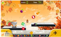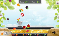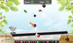 春意盎然,有沒有?榨汁機最開始是在中央,隨著你手機的擺動它也會跟著擺動儘量的接住每一個掉下來的水果,這樣你才會有果汁喝喔!