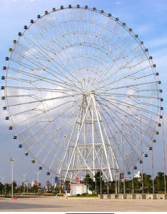 在北京朝陽公園。其地面高度208米,輪盤直徑約198米,安裝在輪緣上的48個同步鏇轉的空調轎廂,每個最多可載客40人,晴天時的遠望距離可達幾十公里。高聳入雲的觀景巨輪與京廣中心等高,該項目投資近9900萬美元,2008年奧運會前竣工啟用。