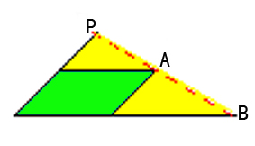 原理:放大尺的原理是位似形性質,如圖,綠色部分就是由4根木尺製成的平行四邊形。P,A,B三點始終在一直線上,兩個黃色的三角形相似。