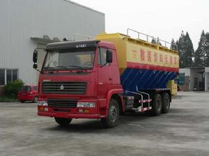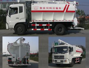 散裝飼料車(bulk feed truck),全稱為散裝飼料運輸車。主要用於從飼料廠向畜牧場養禽場及飼料加工用戶運輸散裝飼料成品或飼料生產原糧,同時它也可用來運輸某些無腐蝕性粉粒狀原料,如製藥廠粉料和糧庫周轉。散裝飼料車的飼料罐架設在卡車的底盤上,罐頂開有進料口.頂部的一根螺旋輸送卸料管(俗稱卸料絞龍)則可自由迴轉和抬升,抬升的仰角可達60度。運輸時,頂部的螺旋管平臥在罐頂;卸料時則抬起,使管端的出料口與畜禽飼養場貯料罐頂部的進料門相接,駕駛室內裝有操縱裝置(操縱裝置也可裝置在罐體尾部),卸料時通過車底的動力輸出軸和減速器來驅動螺旋,以完成卸料。目前國內主要推出3T、5T、8T、11T、15T和22T等多個噸位車型。
