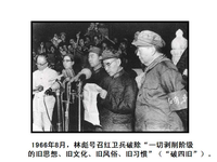 文化大革命 林彪進行的“破四舊”1964年中宣部、教育部頒布《關於改進高等學校、中等學校政治理論課的意見》指出:“政治理論課必須從思想上和理論上積極參加這一場階級鬥爭……必須以毛澤東思想為指針把宣傳毛澤東思想作為最根本的任務把毛主席著作作為最基本的教材。”強調“教師隊伍必須革命化”“各地黨委宣傳部和高等學校、中等學校的黨組織加強對政治理論課的領導”。1964年教育部、文化部聯合發出通知:採用《毛澤東著作選讀》乙種本作為高中政治課代用教材。共青團批示必須把組織青年學習毛主席著作、學習毛澤東思想放在團的全部工作中的第一位。1960年政協全國委員會常務委員會通過了《關於在各民主黨派、工商界、知識界中間開展學習毛主席著作運動的決議》。