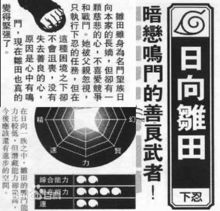 木葉忍者村的忍者,是日向家族的長女,也是火影里溫柔可愛的女忍者。但是對人們寄予自己的厚望一直逃避著,在中忍考試第三輪的預選中,她遭遇了一直憎恨本家的堂兄寧次。看到鳴人為自己加油,雛田終於鼓起勇氣挑戰自己,結果還是輸了。