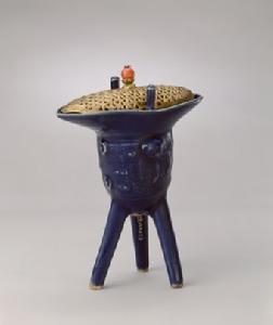 杯造型和紋飾均模仿古代青銅器。橢圓形口,配一銅製珊瑚圓紐鏤空蓋。深腹,下承以三柱形足。通體施回青釉,釉色呈淡紫藍色。腹部飾回紋、獸面紋和鼓釘紋各一周。釉面勻淨潤澤,釉薄處映出白色胎骨。杯底無釉露胎,署陰刻楷體“大明嘉靖年制” 雙行六字款。