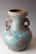 銅胎,束頸,雙獸環耳,鼓腹,圈足。外體飾掐絲琺瑯纏枝蓮紋,口內有蘭琺瑯釉書寫一楷書“王”字。釉厚體重,造型端莊穩重。