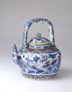 此壺為宮中飲茶用器。構圖飽滿,紋飾線條較粗,圖案生動活潑。
