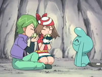小霞/夫蘆拉/小建三人去尋找小智,到達地點小霞對夫蘆拉說:"他就是這么冒冒失失的,跟著他就是很辛苦呢"