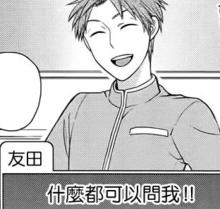 友田 | 友田(Tomoda) 聲優:日野聰/水島大宙 某男性向遊戲中主人公的好友,該遊戲被御子柴実琴用來學習如何了解女人心。 性格溫和友善,在幫助主人公的時候不遺餘力,讓玩到入戲的野崎梅太郎和御子柴無比感動,以為友田是喜歡主人公才這么做的。野崎決定用自己的筆讓他得到幸福,於是給他和遊戲主人公畫了一篇情感故事,但因為“在日本禁止同性結婚”而作罷。 |