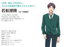月刊少女野崎君[椿泉所創作的四格漫畫] | 若松博隆(Wakamatsu Hirotaka) 聲優:木村良平/浪川大輔 高中一年級,身高185cm。 生日:9月3日(睡眠日) 星座:處女座 野崎的後輩。屬於籃球部。 國中時就是野崎的學弟,認為野崎打籃球時很帥氣,對他引退改畫漫畫感到惋惜。 個性纖細,受到女子籃球部協力者瀨尾影響而失眠,後來靠著野崎取得的歌曲錄音後於終於能夠安眠,但他並不知道那些歌曲的演唱者是瀨尾。偶爾會幫野崎擦鉛筆線條。其實是個上網點的好手,因為不擅長記憶網點號給於是每個網點起了名字,漫畫29話後使用著瀨尾贈送的裁紙刀。 於漫畫66話向結月假裝告白後發現結月不擅長應付這種事,而找到了一個喜歡結月的地方。 |