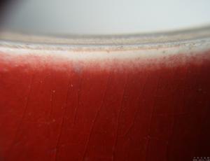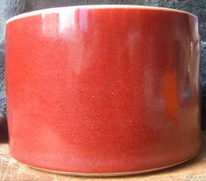 郎窯紅與祭紅的區別:郎窯紅與祭紅在外觀上的各自特徵為: 1郎紅釉面玻璃光澤強烈,釉子清澈透明,光亮奪目;祭紅的釉面凝厚瑩潤,釉子濃郁呈失透狀。 2 郎紅釉流動性大,口沿下因此顯露出白色胎體,此“脫口”為郎紅典型特徵,再則,底足有一環深褐色的積釉,稱“垂足”,但流釉一般不過足,故所以郎紅瓷獨具“脫口垂足郎不流”之風貌;祭紅基本是色不脫口、釉不垂足,即使底足略微有積釉現象,由於積釉較薄、規整,亦明顯有別於郎紅。祭紅的另一特徵是器口與足根處,均有醒目而地道的“燈草邊”;而郎紅器要么沒有“燈草邊”( 單層釉),要么系“人為塗施的一層厚而含有粉質的白釉或漿白釉”( 雙層釉)(耿寶昌《明清瓷器鑑定》P64、P221頁、紫金城出版社、1993年版); 3 郎紅的釉色鮮紅艷麗,由於流動性大,通體上下、甚至前後,釉色的變化顯得活潑、靈動、多姿:器物口沿下露白,器身越往下色澤越濃重,釉色濃處好似牛血初凝,而紅釉稍薄便會出現如雞血一般鮮紅,非常美妙。這艷麗的釉色,被看成一代絕品,是郎窯瓷的代表作。其近底足處又常因積釉過厚呈暗紅色或黑褐色,且會出現一環呈羽翅狀的黑色紋理(俗稱野雞翅),又非常奇特;祭紅則釉色通體勻淨、少見變化,相對而言,典型永宣祭紅釉呈鮮紅色,口或底邊的“燈草邊”較寬,在3~5毫米之間,清代紅釉大多色澤凝厚深沉,口或底邊的“燈草邊”較窄,約1~2毫米左右。 4 用放大鏡可見到,郎紅的釉內氣泡既細小又稀疏;清代祭紅的釉泡相對較大、較稠密,而永宣祭紅釉的氣泡分布,則介於兩者之間,不太稠密,然而,氣泡卻個子大,大得憑肉眼就能一目了然。 5 郎紅的釉層內開有大小紋片,祭紅無紋。 6 郎紅的釉面光爽,釉面上的桔皮紋現象偶爾有之(早期康熙仿明的釉面多有棕眼、桔皮紋);祭紅大部分有桔釉現象,對比之下可見,明代的桔皮紋較清代大,而清雍正桔皮紋則較乾隆朝大。 7 郎紅的底足與器內,或呈米黃色或呈淺綠色,俗稱米湯釉與蘋果青釉,也有少數底為本色的紅釉底;而祭紅的器內器外,均無此特徵(指米湯釉或蘋果青釉或紅釉底特徵)。8 康熙的官窯器自康熙十九年起大多帶上款識,但郎紅器均無款;而祭紅器通常署有官款。 另外,郎紅釉的器型以瓶與尊為主,祭紅釉習見壺、碗、盤、洗、缽和瓶,瓶多為梅瓶與玉壺春瓶。器型上的這一差異,在甄別時亦不能不察。