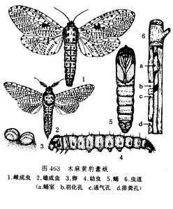 成蟲 雌蟲體長 25—44 mm,翅展40—70 mm。體灰白色。觸角絲狀,淺褐色。前翅前緣從肩角到項角排列著10個藍斑點,中室內斑點較稀疏,有些個體中室有1塊較大的、由幾個斑點組成的藍黑斑;後翅灰白色,斑點稀少而色淺,有翅經9根。胸部背面有3對藍黑色橢圓形斑點,第一至第七腹節各有8個藍黑斑,第八節有3條縱黑帶。雄蛾體長 16-30 mm,翅展 30-45mm,觸角基半部雙林齒狀,端部絲狀,後規有翅級1根。 卵 橢圓形,長徑 0.8 mm,短徑 0.6 mm,粉紅色或黃白色,近孵化時黑褐色。 幼蟲 老熟幼蟲體長 30-80 mm,頭寬 4.5-7.0 mm,體淺黃色或黃褐色。頭部淺褐色,單眼區有褐色小斑;前胸背板發達,後緣有1個黑斑,生有4列鋸齒狀小刺和許多小顆粒。體節上各有黃褐色毛瘤,瘤上有灰白色剛毛。胸足黃褐色。腹足赤褐色,趾鉤多形環。 蛹 雌蛹體長 26-48 mm,雄蛹體長 17-32 mm,長筒形,赤褐色。頭頂具一齒突,雄蛹觸角基半部明顯鼓起。腹部各節有2橫行小刺突,臀部顏色較深,上有許多顆粒狀小刺。