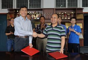屈展校長(前排左一)代表學校與朱華揚教授(前排右一)簽訂聘用契約