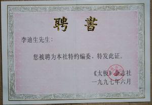 一九九七年六月被聘為《太極》雜誌社特約編委。