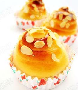5.由上而下捲起,收口捏緊,從中間一切為二,切面朝下放紙杯里,排入烤盤裡.