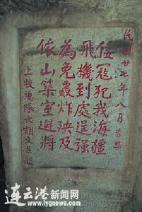 東陬山“藏軍洞”東陬山南麓的“藏軍洞”,作為雲台山重要抗日石刻群之一,最近被省政府公布為第五批省級文物單位。“藏軍洞”是1938年國民黨少將總隊長胡文臣駐守東陬山時留下的抗日遺址,距今已有60多年的歷史。此刻位於連雲區東陬山山西的山洞裡,洞深有十幾米,鋼筋混凝土結構,刻面75×100厘米。刻文為:“民國廿七年八月吉旦。倭寇犯我海疆,飛機到處逞強,為免轟炸殃及,依山築室避將。上校總隊長鬍文臣題”,正文字徑15×15厘米,落款字徑6×6厘米,楷書。