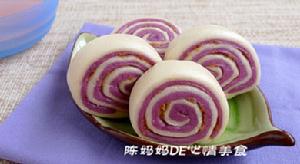 3、麵粉分成兩等份,分別滴入幾滴橄欖油,其中一份加入蒸熟、去皮、碾成泥的紫薯。用不超過35度的溫水將酵母和白糖化開後靜置10分(伏天也可用涼水,靜置的時間5分鐘),酵母水分成兩份,少一點的加入紫薯麵團,多一點的加入白麵團。