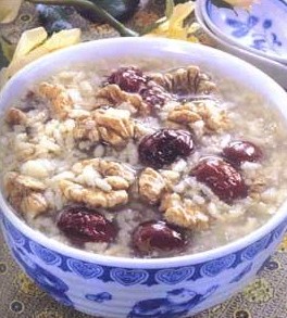 核桃粥 核桃又名胡桃,是美容食品中的佼佼者。歷代醫書對核桃美容健身作用極為推崇,稱其能“通經絡、潤血脈,黑鬚髮,常服皮肉強膩光潤”。《本草綱目》也稱核桃有“黑髮、固精、治燥、調血之功”。