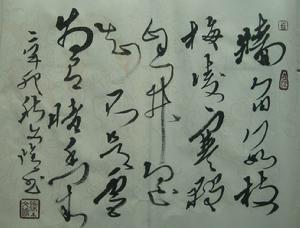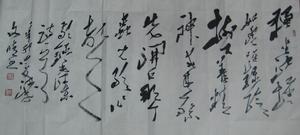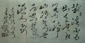 余書學之路,愛好時間長,研創時間短,尤其二王用功最勤,感悟真諦,妙得其法。進京深造和定居以來,觀念新了,路子正了,方法對了,眼界高了,變法快了。書法技藝猶有神助,似乎有突飛猛進之勢。行楷書:清秀,端莊,勁健,面貌為之一新;草書氣勢雄渾,昂揚向上,瀟灑浪漫,自然流暢,輕快靈動。既有毛體書風,又凸現自家面貌。其代表作毛澤東《菩薩蠻登黃鶴樓》,《詠蛙》二首草書新作,獲2011年9月紀念毛澤東逝世35周年《翰墨思偉人》全國書畫大展金獎。