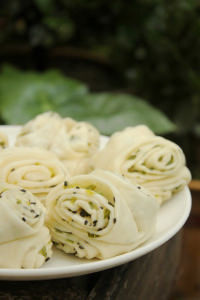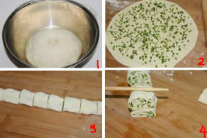 二、準備配料小蔥切碎、食用油、椒鹽(如果買不到現成的,也可以自己做,花椒粉、芝麻粉和食鹽混合即可)。 三、製作花捲1、發好的麵團重新揉制5分鐘,用擀麵杖擀成圓形的薄皮。2、用刷子蘸取適量食用油均勻的抹在薄麵皮上,然後將小蔥花撒在上面。