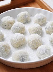 椰蓉芝麻糯米糍是甜食,食材有糯米粉,玉米澱粉,黑芝麻,椰蓉。