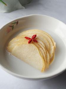 因梨有寒性,講究些的人家多製成羹湯或小吃。如蒸梨,是傳統的食療補品,製法是把梨從蒂下三分之一處切下當蓋,挖去梨心,掏空梨中間果肉切塊,與川貝母粉、陳皮絲、冰糖屑等一起裝入梨內,再放進加入清水的蒸杯內,武火蒸45分鐘即成,對嗓子具有良好的潤澤保護作用。晉菜佛門素齋中有甘露盅,系西瓜盅演變而來,還有一道名吃叫炸鮮果卷,是將蘋果與梨去皮切絲,加入糖桂花、麵粉拌勻,用油皮卷好,投入油鍋炸熟,外酥里嫩,香甜適口,果味芳香。晉南民間宴席有以梨製作扣肉,是將五花肉片與梨片一層一層碼好,放入碗內加上冰糖蒸熟。如果將梨削皮切條拌以山楂糕條,澆上梅子醬、糖桂花,就可製成一碟酸甜清脆的冷盤來。(黑體部分源於太原日報,為的是讓自己在寫美食的同時,更好地了解山西歷史,也與大家分享!)