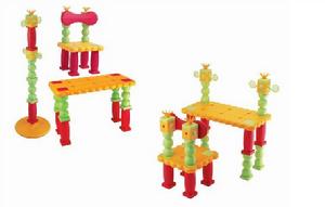 拼裝家具:是指利用不同形狀的的木頭或塑膠固體玩具,進行不同的排列或進行建築活動,搭建出桌椅、兒童床、房屋等。