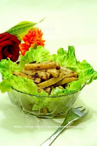 (3) 淨鍋內放入橄欖菜煸香,放入瀝乾油的冬筍條, 加清水半杯炒勻, 調入少許鹽(橄欖菜有鹹味,注意鹽的用量)略微煮一會兒,讓冬筍入味,蘑菇精,(代替味素)炒勻,勾一點點薄芡,拌勻起鍋,盛入盤內稍擺盤即可。