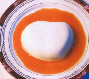 鍋中加入少量清水,倒入牛奶、義大利香草粉、魚膠、糖、鹽,待濃度合適時倒入模具中冷卻定形,成品邊上淋上橙汁即可