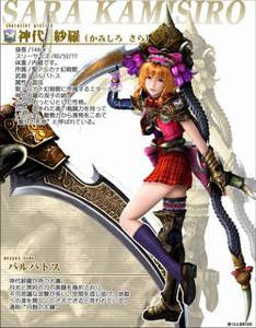 | 神代紗羅 身高/144cm 三圍/80/52/77 體重/保密 所屬/聖阿露卡納幻殺館 武器/巴貝多 屬性/混沌 隸屬於聖阿露卡納幻殺館的永恆,神代由羅雙生的姐姐。相當穩重的性格,不過因為其擁有的超越一般的強大戰力,被敵勢力帶著敬畏呼作“朧月的死神”。 巴貝多 神代紗羅持有的大鐮,濃縮了月光與冥府之力,多出現詭異的攻擊。據說可以歪曲空間,甚至打開通往地獄的道路,通稱“月蝕的大鐮”。 | ![]() |