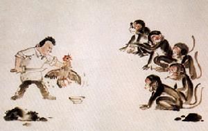 “殺雞儆猴”說的是殺掉雞來嚇唬猴子,比喻懲戒一個以警戒其餘。在耍猴人看來殺掉雞的成本遠遠低於殺掉猴子的成本,雞較之於猴子要無用的多。而雞們一向是“作秀”的高手,什麼“雞飛狗跳”、“蛋打雞飛”,總之上得了台面,於是被殺的雞總要把“被殺”演繹成一場大張旗鼓奢侈鋪張的大片。滿地雞毛的掙扎,血流四處的慘境,呼天搶地的鳴冤。用這種效果來嚇唬猴子是綽綽有餘的了,猴子們自然不想身首異處,只得俯首帖耳不敢造次了。古人按語