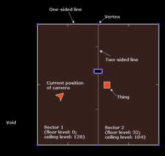 毀滅戰士引擎並不是一個“真三維”的引擎(因為在遊戲中玩家不能向上或者向下的觀看),但是這是第一個有活力的仿三維引擎。在那個時代,毀滅戰士引擎在遊戲界掀起了一場革命,並且用一己之力創造了一個支持材質貼圖的三維環境。 毀滅戰士關卡結構 簡單的示意毀滅戰士的地圖的結構