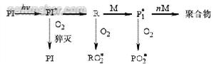 基態的O2本質上是雙自由基,因此對光引發過 程中產生的活性自由基有較強的加成活性[k 10 9 /(mol·s)],形成比較穩定的過氧化自由基。此過程 速率較快,可與活性自由基對單體的加成反應相競爭 對聚合過程的阻礙作用最顯著。它可以分為以下2個 步驟: