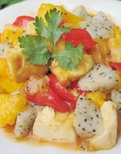 豆腐1塊、木瓜100克、火龍果100克、甜紅椒1個、番茄醬2大匙、鹽1小匙、糖1大匙、醋1小匙、生粉2大匙。