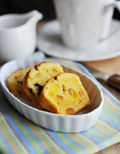 低筋麵粉60克、杏仁粉40克、黃油100克、糖粉60克、全蛋100克、泡打粉1/2、芒果汁30ml、果乾50克、朗姆酒30ml。