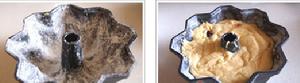 7、模具中鋪上油紙,倒入麵糊約7分滿,用刮刀抹平表面。放入預熱好的170度烤箱,中層,烤30-40分鐘左右即可。烤制約10分鐘左右的樣子,表面會行程一層硬殼,用刀子在蛋糕中間劃開一道口子,再繼續入爐烘焙至熟。