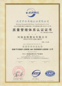 金銓塑業高度重視產品的質量、安全、環保和節能等工作,金銓牌系列產品通過了“中國環境標誌產品認證”,給水系列產品通過了“新華節水產品認證”,公司全面通過ISO9001:2008國際質量管理體系、ISO14001:2004環境管理體系和OHSAS18001職業健康管理體系的一體化導入工作,並建立起了規範的現代企業管理體系。在長期開展“現場質量評價”活動及“卓越績效管理”的同時,金銓人始終牢記百分百合格品和零缺陷的質量意識,產品質量和性能得到了持續的最佳化和提升,並評為“河南省質量管理先進企業”,確保了客戶買得滿意、用得放心!