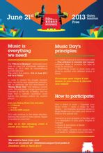 2013中法文化之春宣傳海報從巴黎到北京、武漢、上海、成都和廣州,法國音樂節落地中國各處。1982 年,由時任法國文化部長雅克· 朗創辦的這一深受大眾歡迎的獻給各種音樂形式的盛會,在創辦之初就已取得巨大成功。時至今日,法國音樂節已經被全世界許多國家接納,每年在五大洲110 個國家的340 多座城市舉行。北京、武漢、上海、成都都於近六年內舉辦了該項盛會。廣州也將第一次加入法國音樂節的活動中,參加借順德音樂節。