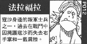 法拉福拉,寇沙身邊的叛軍士兵之一,過去在戰鬥中因掩護寇沙而失去右手掌和一截肩膀。