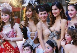 泰國人妖泰國的人妖,主要集中在曼谷和芭堤雅,而尤以芭堤雅為多。芭堤雅是泰國的花城,是著名旅遊勝地,該城有兩個人妖歌舞藝術團。除了可以遊覽其優美的自然風光外,更重要的節目是觀看具有最高水準的人妖藝術表演。劇場是一個能容納六、七百人的建築,平時都是座無虛席。觀看者大都是各國旅遊者。這兒經常是高朋滿座。有些歐美人專程坐飛機來看人妖表演,看完後馬上又飛走。