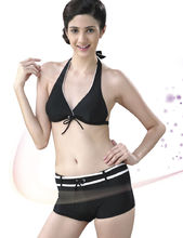 比基尼管狀比基尼可分兩種:有吊帶和無吊帶的。如果你身材嬌小,選擇沒有吊帶的比基尼可以將別人的目光轉移到你性感的肩膀,達到取長補短之效。但是,無吊帶比基尼可能會讓你沒有安全感,少了兩條肩帶,比基尼胸罩很容易移位,在池中調整胸罩可是非常尷尬的事。建議你在作日光浴時,才穿上無吊帶比基尼,這樣你在日光浴後,不會有礙眼的肩帶痕跡。如果你打算在池中游上七八圈,最好選擇比較"安全"的比基尼。而肩膀較寬者可選擇有吊帶的管狀比基尼,不但可掩飾肩膀寬的缺點,也顯得有形有款。同時裝一樣,泳裝潮流是以光滑閃亮的布料為主。銀灰和珍珠色等多種晶瑩的淺顏色都成為泳裝的主角。亮珠片和單肩式樣等細節也從時裝流行到泳衣身上。平腳褲式的管狀比基尼,也是保守人士的首選,讓你流露灑脫的一面。