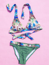 這一主題風格的比基尼以印花彈性面料為主,款式類似運動內衣。整體式寬肩帶,有直線拼接,橫線拼接,也有斜線拼接。底褲是中腰三角褲,裝飾簡練,主要是雙線縫痕和沿邊方式給人有大方可愛的印象。